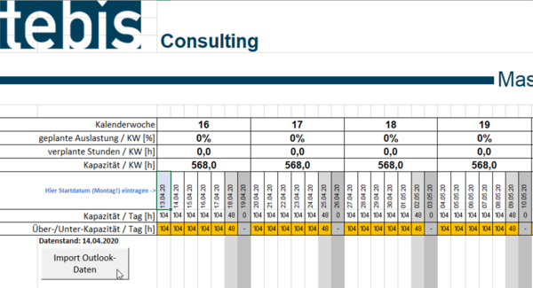 In der Arbeitsmappe „Auslastungsforecast“ muss die Schaltfläche „Import Outlook-Daten“ betätigt werden.