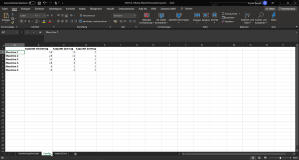 Öffnen der Excel Datei „Maschinenauslastung“ und anwählen Arbeitsblatt „Config“