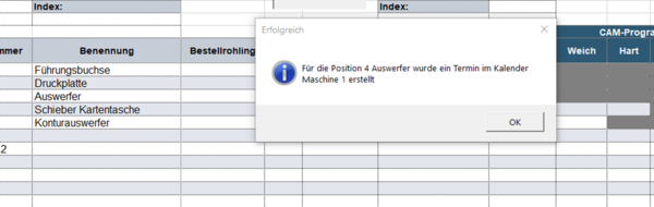 Durch Klicken auf den Schaltfläche „Bauteil(e) einplanen“ werden diese an Outlook übertragen. Es erfolgt zu jeder Position eine Meldung ob die Übertragung erfolgreich war oder nicht.