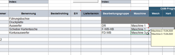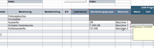Die Übertragung wird in der Maschinenspalte als Kommentar protokolliert. Sollte eine Zelle das kleine rote Dreieck haben, so wurde dieses Bauteil mindestens einmal übertragen. Im Kommentarfeld ist ersichtlich, wann eine Übertragung an welche Maschine stattgefunden hat.