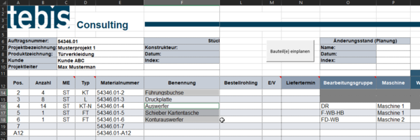 Für das Datum ist die Excel-Formel =heute() hinterlegt. Somit werden Bauteile immer an den heutigen Tag übertragen.
