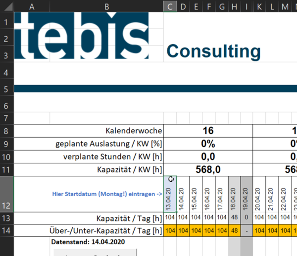 Anwahl der Arbeitsmappe „Auslastungsforecast“ und den gewünschten Startpunkt der Betrachtung in die Zelle C12 eintragen. Dieses Datum muss aufgrund der Formatierungen ein Montag sein.