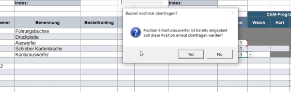 Sollte es notwendig sein, dasselbe Bauteil auf derselben Maschine nochmals einzuplanen, so erscheint ein Hinweis, dass dieses Bauteil zuletzt auf bereits dieser Maschine eingeplant war und ob eine erneute Übertragung erfolgen soll. Entweder mit Ja bestätigen oder Nein auswählen. Bei Nein wird diese Bauteil übersprungen und nicht übertragen.