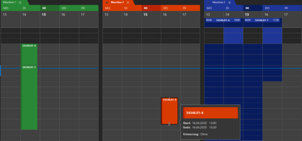 Per drag-and-drop können die Bauteile an den gewünschten Tag und Zeitpunkt verschoben oder die Dauer angepasst werden. Ebenfalls funktioniert das „ziehen“ des jeweiligen Eintrags.