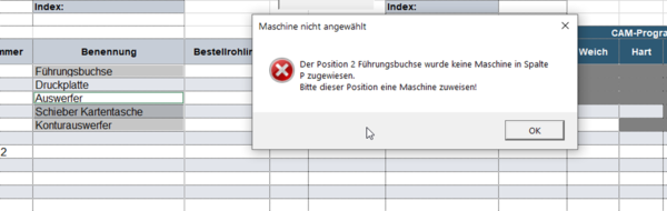 Sollte einer selektierten Position keine Maschine zugeordnet sein, erscheint eine Meldung und die Position wird übersprungen.