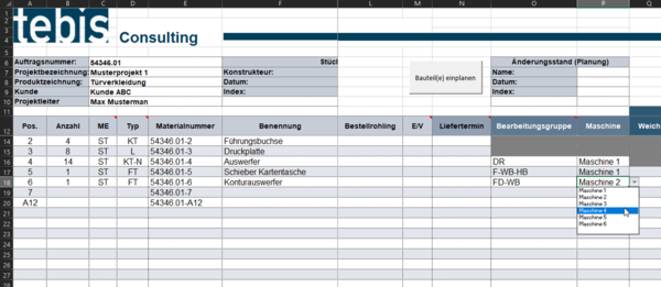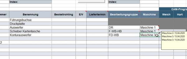 Mittels DropDown Menü müssen die Bauteile den entsprechenden Maschinen in Spalte P zugeordnet werden. Möglich ist auch kopieren/einfügen.