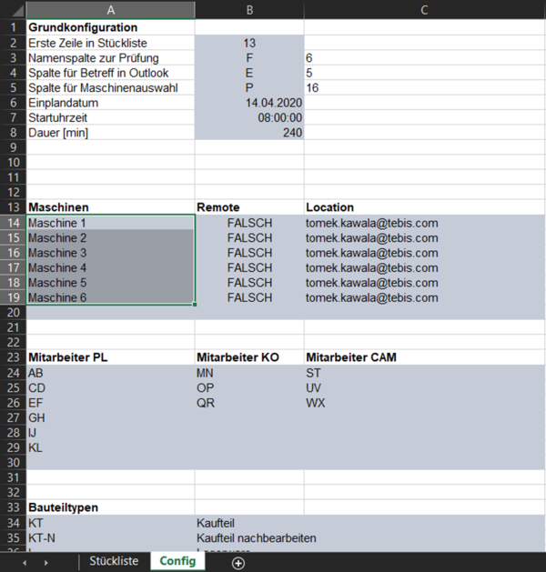 Öffnen Stücklisten Vorlage und das Arbeitsblatt „Config“ anwählen. Eintragen der entsprechenden Maschinen, die im Outlook definiert wurden.