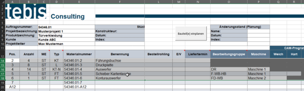 Aufgrund der Vielzahl an Bauteilen, welche im Produktiv-Betrieb in den jeweiligen Kalender übertragen werden müssen, empfiehlt es sich die Verwendung einer Stückliste als Datenquelle. (siehe Abschnitt C. Verwendung einer Excelstückliste)
