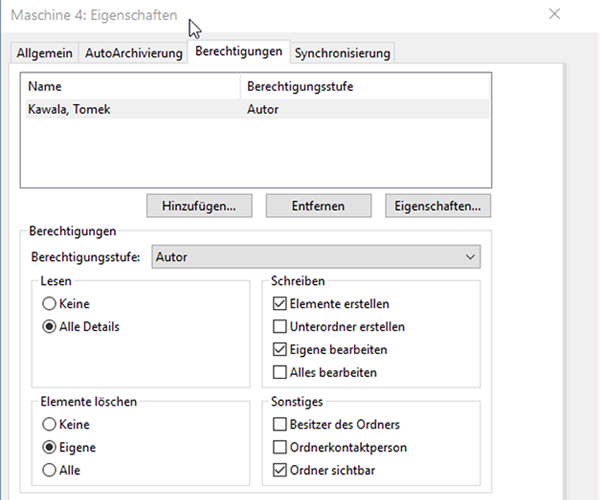 Bei einem Mehrfachzugriff auf den Kalender ist es wichtig die entsprechenden Rechte und Freigaben eingerichtet zu haben. Die Rechte werden mit einem „Rechtsklick“ auf den jeweiligen Kalender definiert. Sollte ein Exchange-Server verwendet werden, sind die Berechtigungen dort entsprechend einzustellen. Empfehlenswert ist die Berechtigungsstufe Autor oder höher.