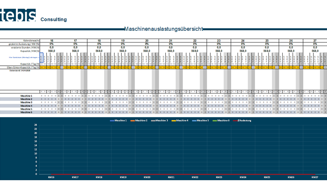 Als Ergebnis ist eine Gesamtansicht der geplanten Maschinen zu sehen. Die Darstellung als Diagramm beinhaltet: Wöchentliche Auslastung der Maschine sowie die durchschnittliche Auslastung pro Maschine und Woche.