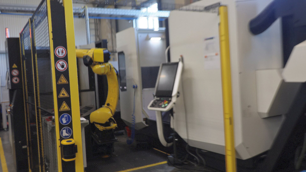 Um die Prozesskette zu straffen, soll die Bearbeitung nach Möglichkeit weitestgehend automatisiert komplett in einer Aufspannung ablaufen. So sollen die Laufzeiten der Fräszentren optimiert und die verfügbaren Kapazitäten bestmöglich genutzt werden. Und die Maschinenbediener sollen gerade beim Be- und Entladen der Maschinen wirksam unterstützt werden. An zwei der 5-Achs-Maschinen stehen bereits Roboter für das Werkstückhandling, das Dreh-Fräszentrum verfügt über eine vollautomatische Beladezelle mit Roboter.