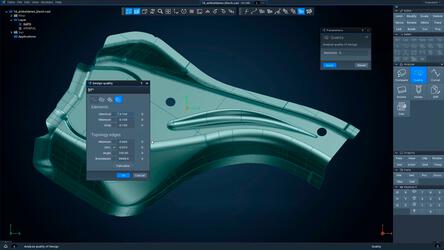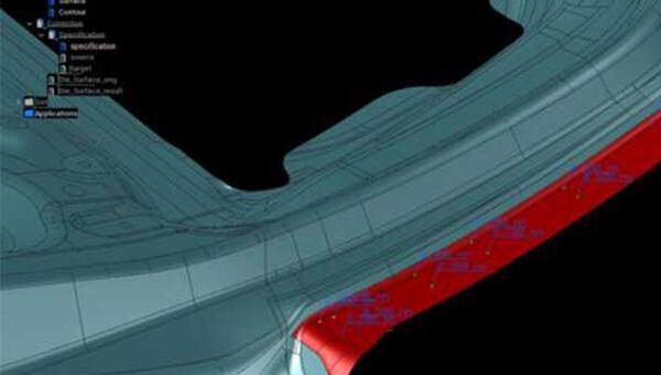 Tebis nutzt deshalb globale Verformungsvorschriften, mit denen sich Einzelflächen auf Grundlage von FEM-Analysen, Messungen, Scanergebnissen oder Erfahrung vollautomatisch verformen lassen – die Rückfederung wird kompensiert und so die Anzahl der Korrekturschleifen entscheidend minimiert. Die qualitativen Flächeneigenschaften, wie Segmentierung, Polynomgrad und Übergänge, werden bei diesem CAD-basierten „Morphing“ optimal an die Verformungsvorschrift angepasst. Analysefunktionen zeigen die Einhaltung der Verformungsvorschrift und die Qualität der verformten Flächen.