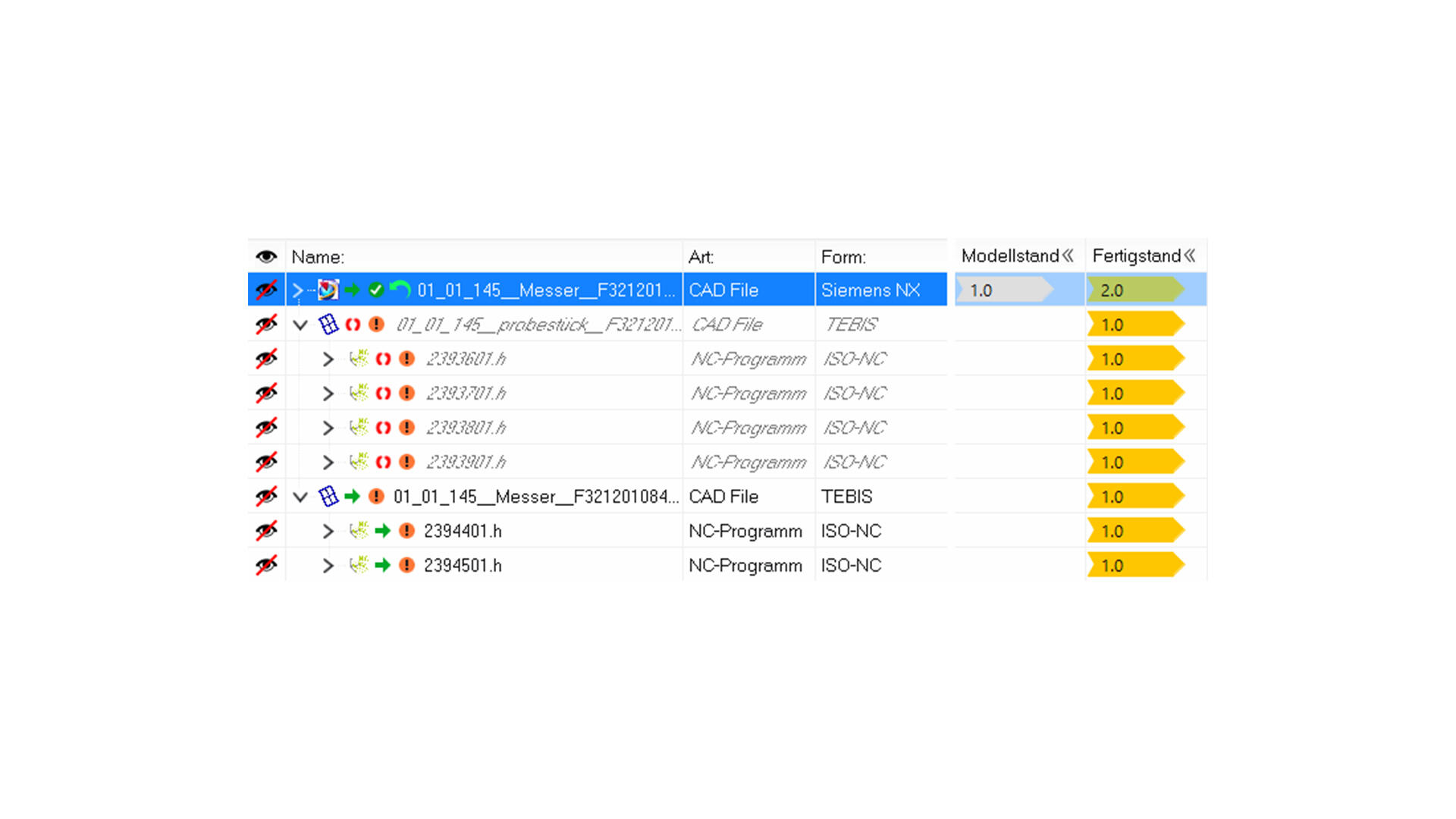 ProLeiS übernimmt automatisch Bearbeitungs- und NC-Programmnamen aus dem Tebis Arbeitsplan und legt eine übereinstimmende Struktur an. Der Programmierer arbeitet in seiner Tebis gewohnten CAD/CAM-Umgebung mit Strukturbaum und Arbeitsplan. Er bereitet die CAD-Daten für die NC-Programmierung auf und lässt die NC-Programme berechnen. Per Knopfdruck startet die Übermittlung an die Maschinen.