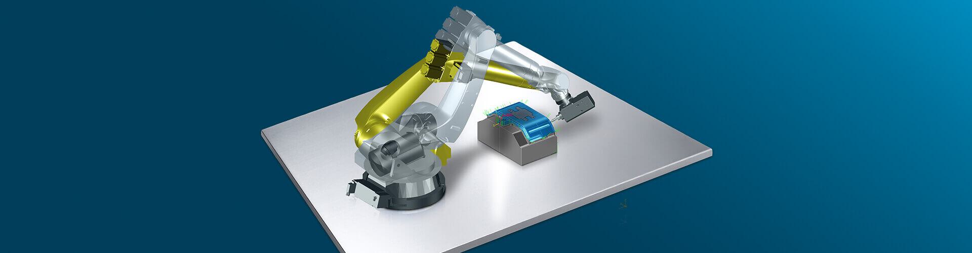 Die Möglichkeiten, NC-Programme für die Bearbeitung mit Industrierobotern zu erzeugen, sind immens verbessert worden. Virtuelle Roboter mit bis zu 6 Achsen und 2 Zusatzachsen sind vollständig in die einzigartige Tebis Maschinentechnologie integriert.