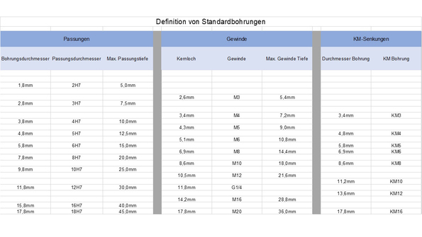 In der folgenden Tabelle Bild 4 ist eine exemplarische Standardisierung aufgeführt, inkl. max. Bohrungstiefen, da mit VHM-Bohrwerkzeugen nur begrenzte Tiefen zu erreichen sind.