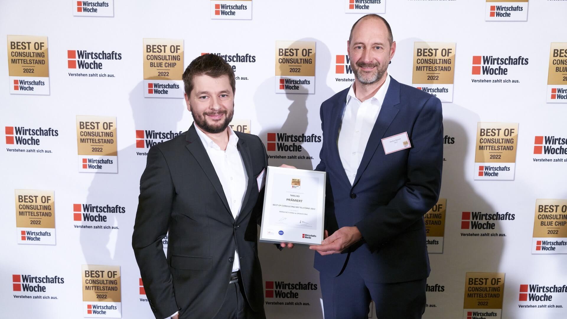 Bildunterschrift: Tomek Kawala (links) – verantwortlicher Berater für das Projekt - und Markus Rausch (rechts im Bild), Tebis Consulting, freuen sich über den Wirtschaftswoche Award „Best of Consulting Mittelstand 2022“. Prämiert wurde Tebis Consulting in der Kategorie „Manufacturing & Operations“