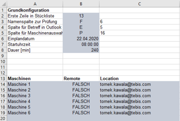 Rows 1 - 20 are for detailed machine planning with Microsoft Outlook and do not have to be changed. If the Tebis Consulting Outlook Tool is also used, see the corresponding description in the "Guideline for detailed machine planning with Microsoft Outlook".