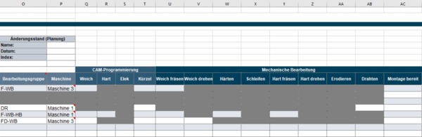 The actual work preparation activity starts in column N "Delivery deadline" or O "Machining group".