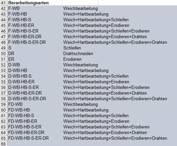 Line 41 and below are for the processing types. These describe the work steps required to manufacture the part. Column A contains the abbreviations selected in the parts list. The processing types are similar to that in a Job Manager.
