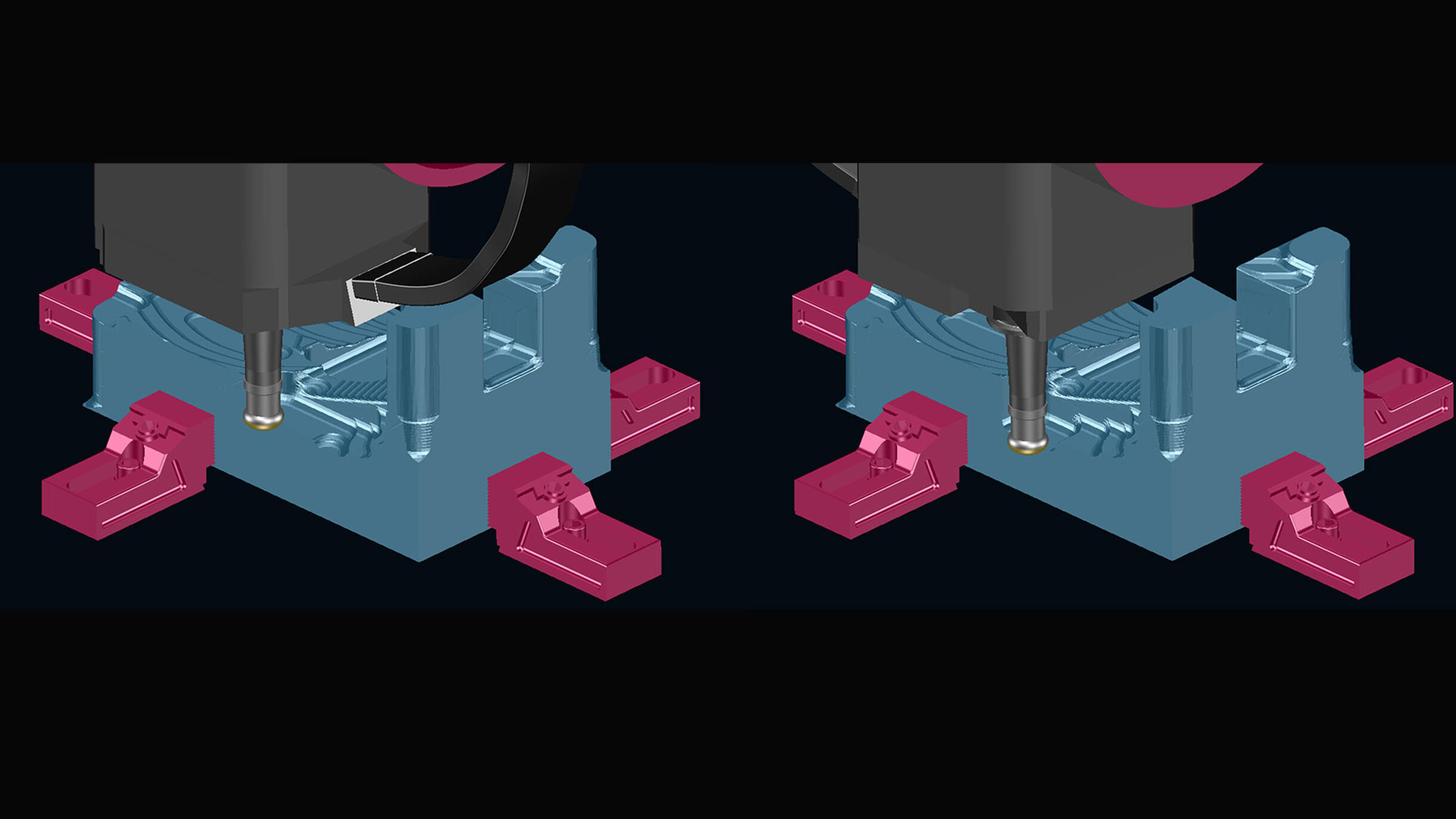 Collisions that can be detected while calculating the NC program can be immediately identified and avoided with the appropriate collision avoidance strategies. The most appropriate strategy depends primarily on the specific component geometry, the machining task and especially the available machine. This knowledge should be stored in NC templates. This means that the CAM programmer only needs to select the machine and machining elements. The appropriate collision avoidance strategy – with area reduction, simultaneous 5-axis avoidance milling or indexed machining – is then automatically assigned in each case.