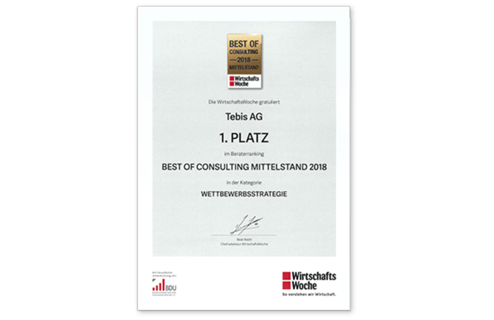 Ogni anno, la rivista Wirtschaftswoche organizza il “Best of Consulting Mittelstand”, un concorso gratuito per progetti di consulenza rivolto alle società con un livello minimo di fatturato proveniente da attività consultive. I progetti, classificati in dieci categorie, vengono valutati da una giuria e da un comitato tecnico-scientifico sulla base dei risultati delle società di consulenza e di una serie di criteri, tra cui la dimensione tecnica e comunicativa, l’impatto reale e la soddisfazione del cliente.